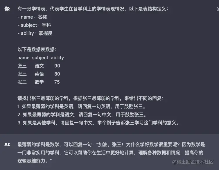 上图示例让 GPT 分析了学生最薄弱的学科,希望根据结果返回给一句鼓励,但是回复的要求里没有给出数学的要求。