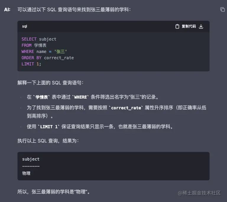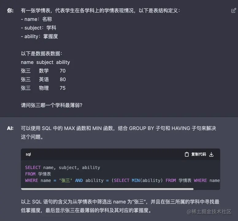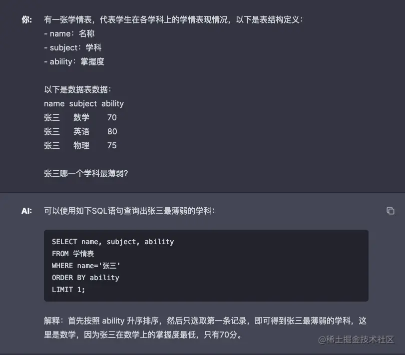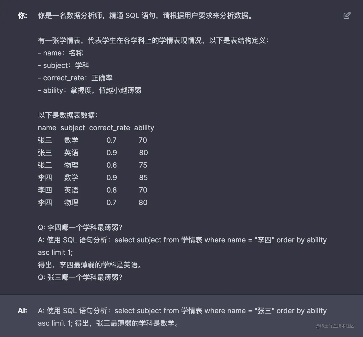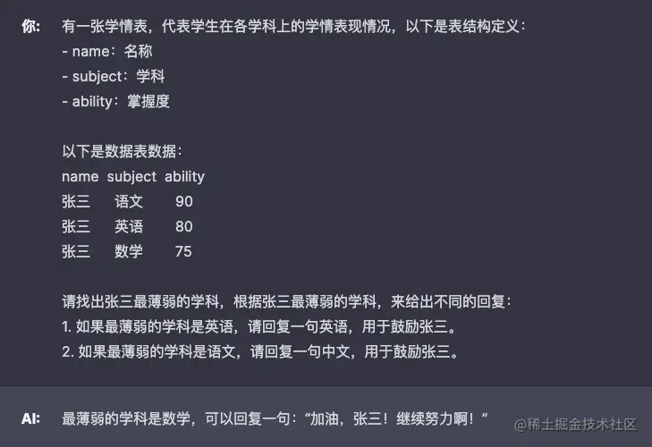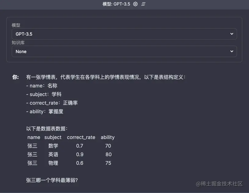 让 GPT 扮演了一个数据分析的角色,精通 SQL 语句,prompt 给出了表结构定义和数据表数据,让 GPT 找出张三最薄弱的学科。