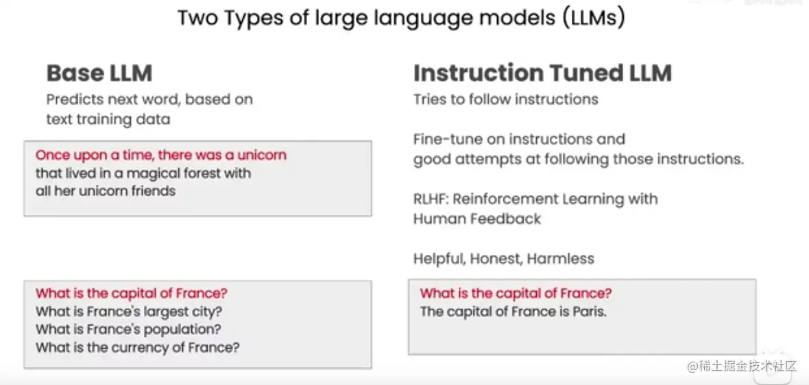 在继续介绍 prompt 核心技巧前,首先解释一个基本原理,如上图(来源于吴恩达教学视频),LLM 本质在做概率预测,上图左侧的 Base LLM ,即为基座模型,比如 GPT-3,该模型在做的是预测下一个单词是什么,可以理解为“文字接龙”,比如图上示例,给模型一个开头 "Once upon a time, there was a unicore",模型会根据这个开头预测下一个最可能的单词,并续写完整段话,因此当你提问 "What is the capital of France",模型不会给你答案,而是预测后面可能会接的文字。而上图右侧的 Instruction Tuned LLM,是经过人类调教后的模型,比如 GPT-3.5,它能更好地识别人的意图,根据人的指令,预测对应的回答。本文后续提到的 prompt 技巧,都是围绕着如何写好这个指令来开展。
