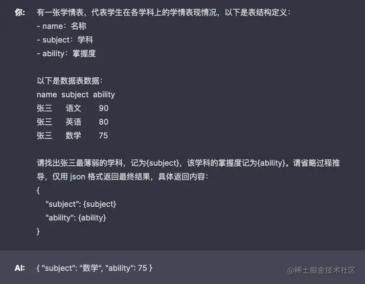 上图示例,让 GPT 返回了张三最薄弱的学科和掌握度,用 json 格式,方便程序后续处理。