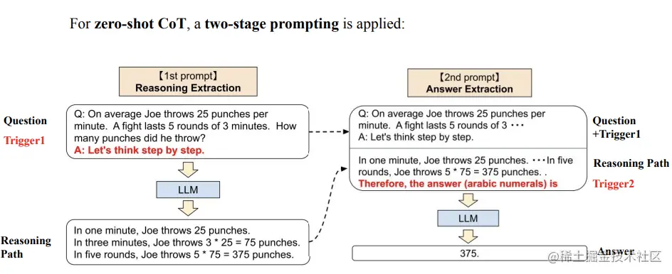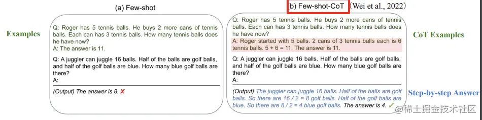 上图给出的 few-shot 样例,不仅只给出答案,同时给出了求解的推导过程,LLM 也会按照这个逻辑推理的方式,去给出分步骤的推理过程,最终得出了正确的解。