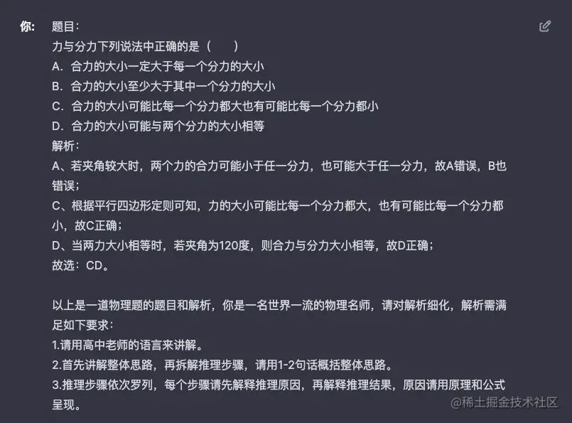 示例希望 GPT 拆解和细化题目的解析,上图是优化前的结果,输出结果虽然也正确,但是讲解偏简单,推理步骤的呈现不是很清晰,难以让学生理解。