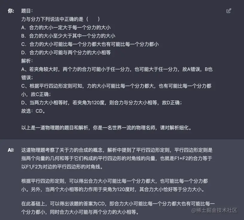 上图对指令做了优化,对解析提出了更具体的要求,可以看到 GPT 的返回比较理想,原理和公式的推导都非常清晰。