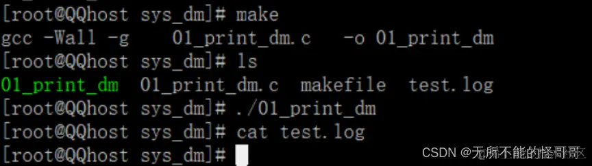 在这个程序中close(1);表示关闭标准输出,在前面我们已经说过文件描述符1代表标准输出,这时候通过open()打开一个文件,我们知道,当打开一个文件的时候会使用一个当前空闲的最小文件描述符,因为前面我们把标准输出关闭了,所以当前空闲的最小文件描述符1分配给open()函数打开的文件。虽然1号文件描述符当前已经不是标准输出(终端显示屏)了,但是stdout依然是指向1号文件描述符的,实际上这就相当于把open()打开的文件当作标准输入输出,printf()打印的内容都会打印到test.log文件内。首先我们屏蔽fflush()函数试一下