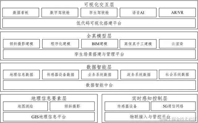数字孪生城市的实现依赖于诸多先进技术的发展和应用,其工程技术体系整体上可以分为五层: