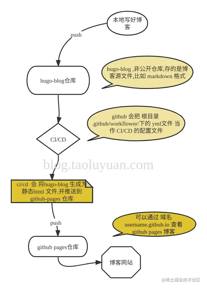 hugo new site hugo-blog命令创建,可以在里面写markdown文件 - 写好后推送到github hugo-blog 仓库,触发github actions ci/cd,执行hugo命令生成静态网站,并且推送到github-pages 仓库