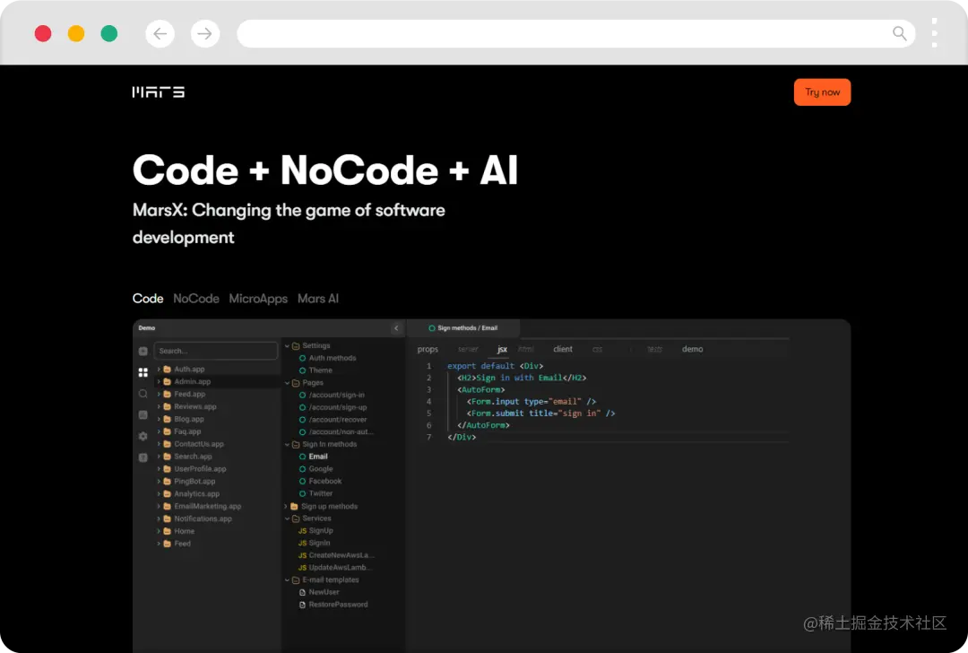 MarsX 是一个人工智能编程平台,它能够帮助人们更快速地开发应用程序。你可以使用 Code、NoCode 和 MicroApps 等工具来构建应用程序,可以提高你的开发速度。平台还提供了预构建的应用程序、网站和电子邮件模板等。