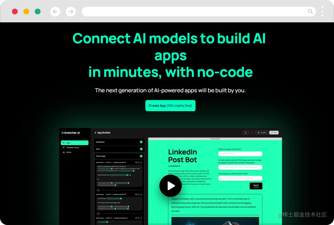 Brancher AI 是一个人工智能应用程序平台,可以帮助用户创建和分享 AI 应用程序,而无需编程知识。它拥有易于使用的界面,强大的 AI 模型,能够轻松创建复杂的应用程序。此外,Brancher AI 还支持来自不同平台和工具的 AI 模型的连接和组合。