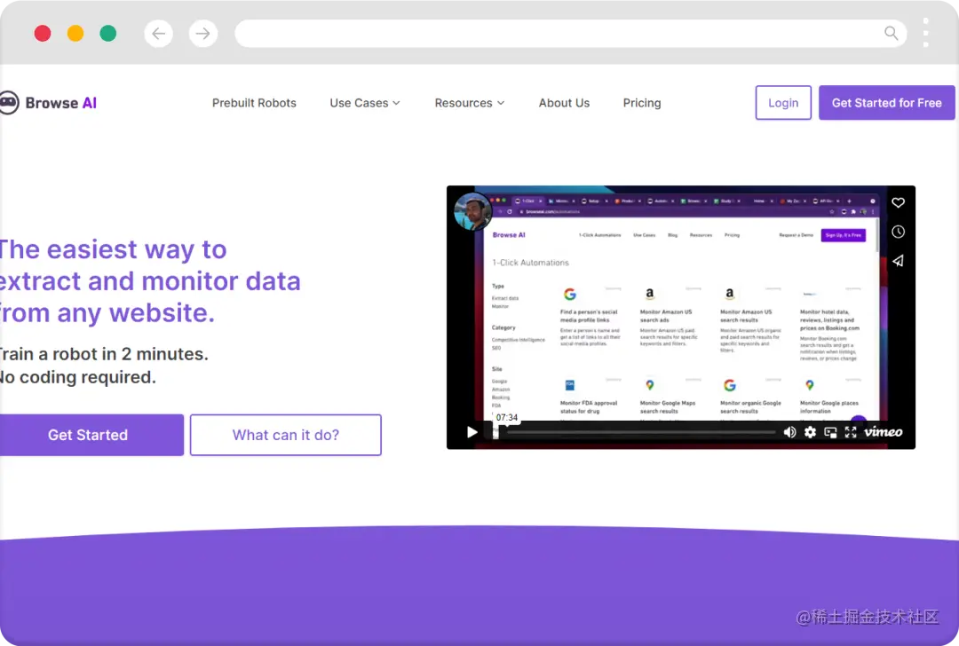 Browse.ai 是一个网页数据抓取和监控爬虫工具,可以让您在几分钟内训练一个机器人,从任何网站提取您需要的数据,无需编写任何代码, 借助尖端技术的帮助,您可以快速地从中数千个 url 中提取数据。