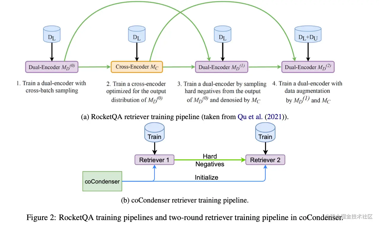 作者使用最近提出的 Condenser 预训练架构,它通过 LM 预训练学习将信息压缩到密集向量中。最重要的是,作者进一步提出了 coCondenser,它添加了一个无监督的语料库级对比损失来预热段落嵌入空间。它显示出与 RocketQA 相当的性能,而RocketQA 是当时比较先进的、经过精心设计的系统,coCondenser使用简单的小批量进行微调。