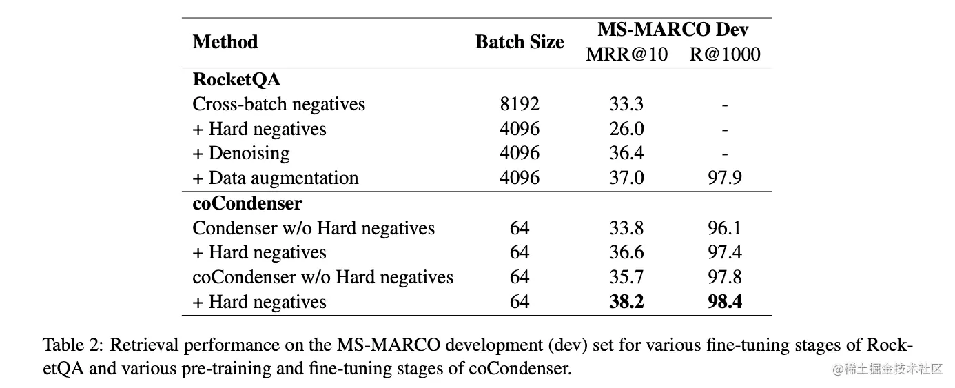 从表格中我们可以看出,RocketQA的batch size和本文使用的batch size的差距还是很明显的,但是从结果上来看coCondenser再加入Hard negatives之后,在MS-MARCO上的表现要优于RocketQA。
