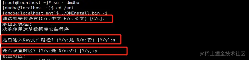 切换至 dmdba 用户下,在 /mnt 目录下使用命令行安装数据库程序,依次执行以下命令安装 DM 数据库。