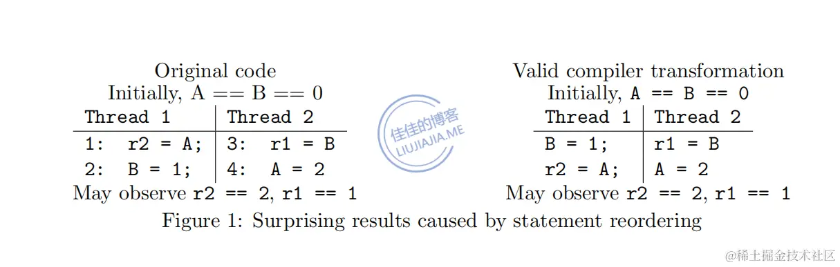 出现第四种情况的原因是指令可能被重排为下图中右侧的形式,此时就可能会出现上面的第四种情况。