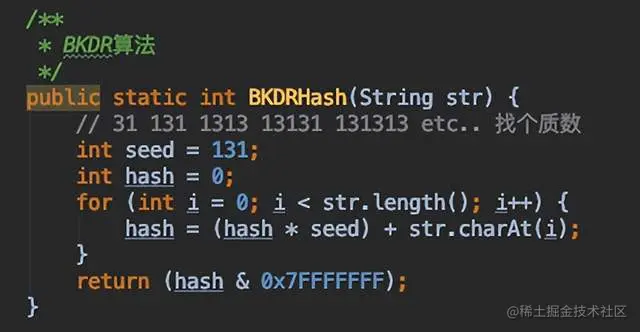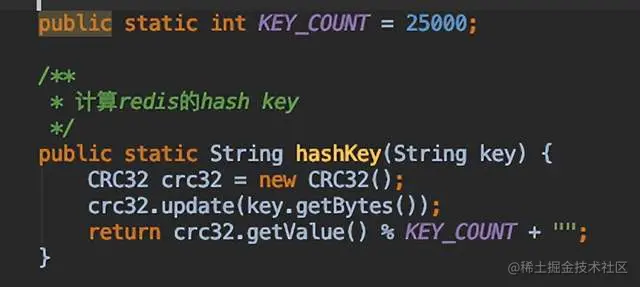 通过第二步,我们确定了key即将存放在的redis里hash结构的外层key,对于内层field,我们就选用另一个hash算法,以避免两个完全不同的值,通过crc32(key) % COUNT后,发生field再次相同,产生hash冲突导致值被覆盖的情况。内层field我们选用bkdr哈希算法(或直接选用Java的hashCode),该算法也会得到一个long整形的数字。value的存储保持不变。