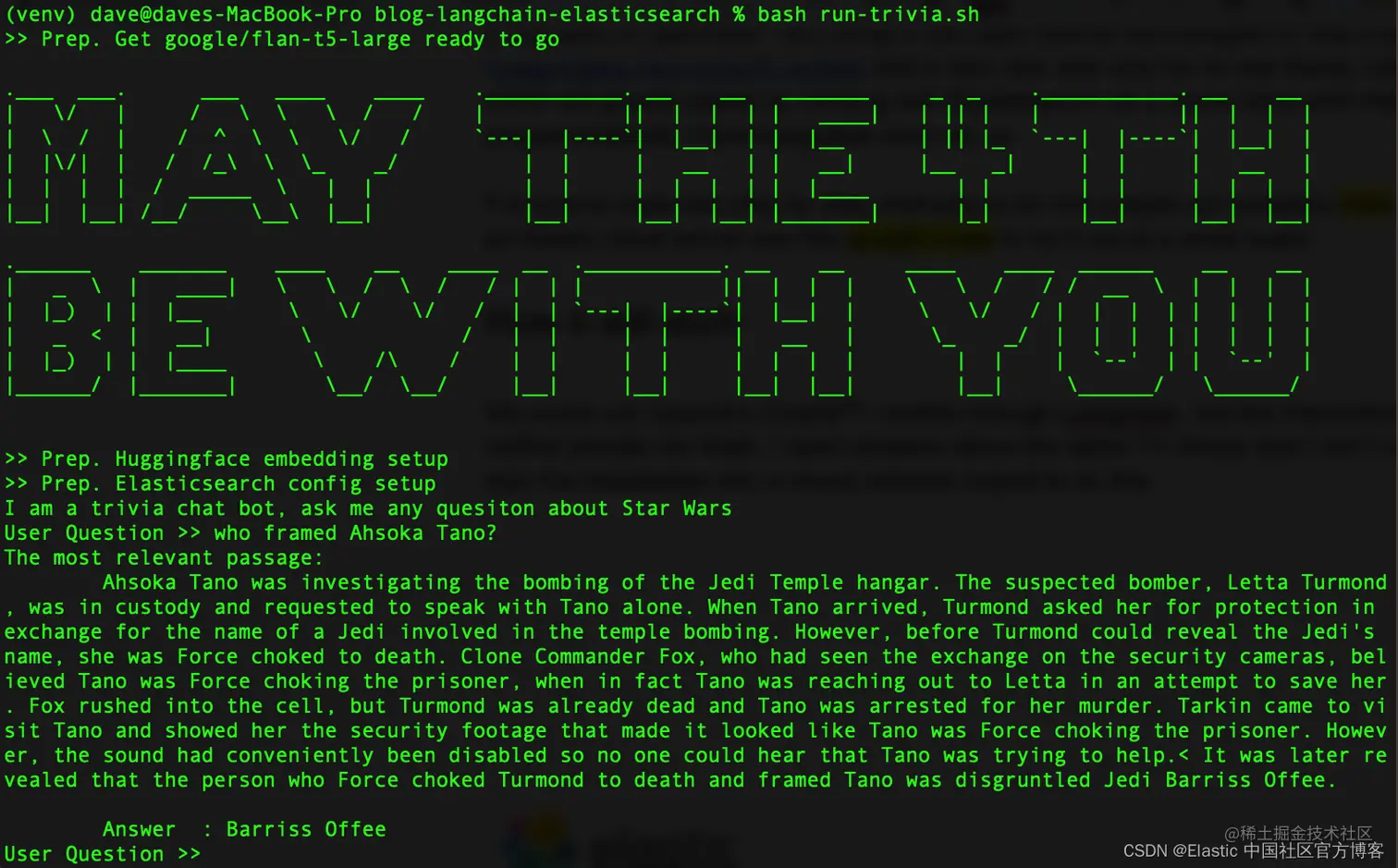 3)当有问题出现时,我们会使用 Elasticsearch 的向量搜索找到与问题语义最相似的段落。 然后,我们将把该段落添加到一个小型本地 LLM 的提示中作为问题的上下文,然后将其留给生成 AI 的魔力,以获得对我们的琐事问题的简短回答。