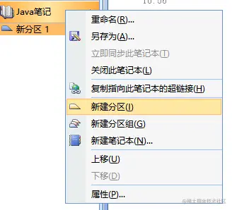 - 第九步:在“Java笔记”上点击右键,新建分区。这里给新分区命名JavaSE。(可以以技术为单位创建新分区,一个技术对应一个分区)
