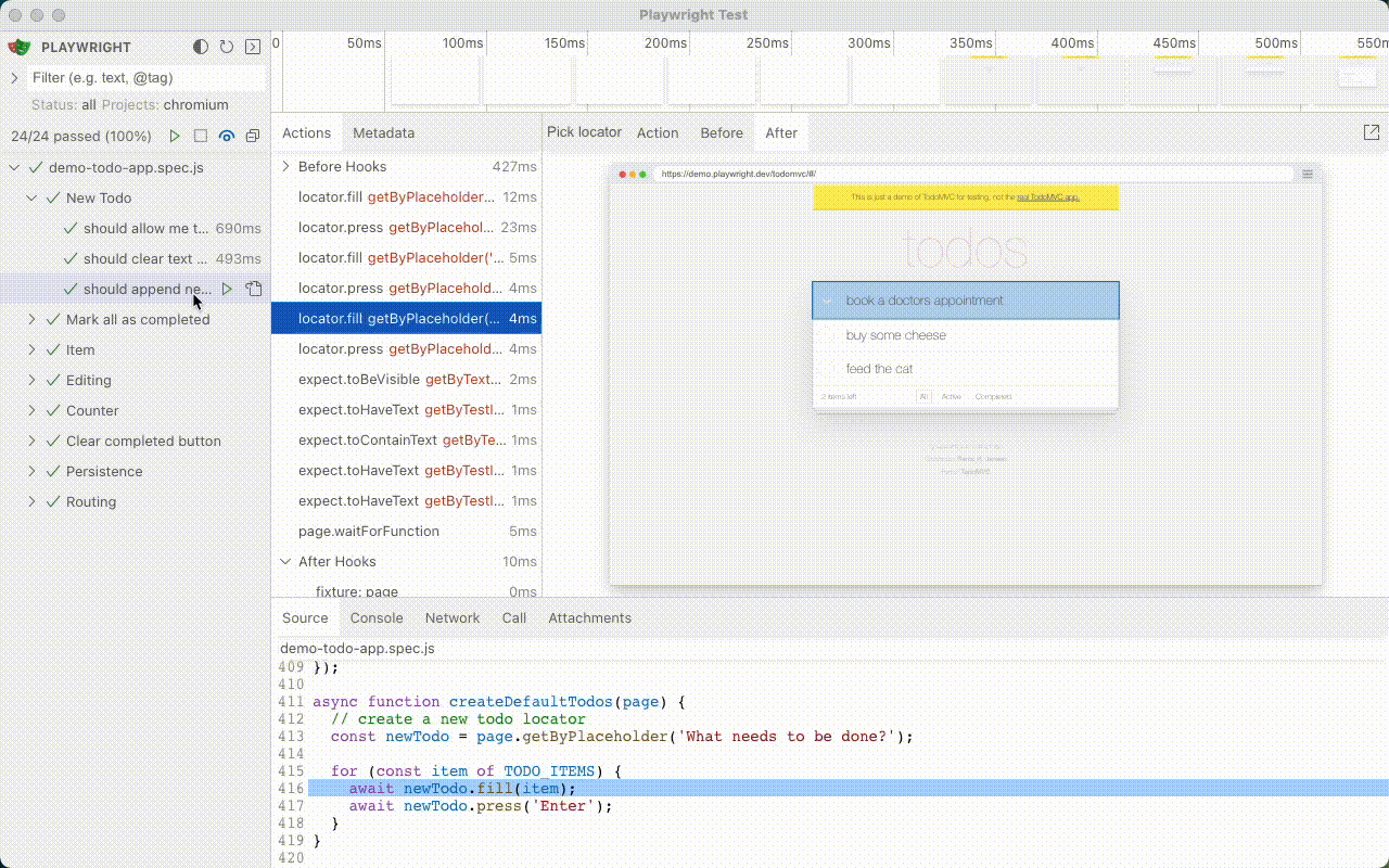 playwright 提供了一个很强大的功能,就是通过使用--ui,启动一个页面,可以很方便地运行测试用例、查看测试结果、逐帧对比测试过程等。这对于设计走查也是非常有用的。