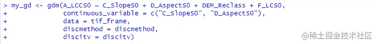 首先,如果大家输入数据中的自变量数据具有连续变量,需要将其转换为类别变量;gdm()函数可以实现连续变量的离散化方式寻优与自动执行。其中,我们可以选择的离散化方式包括相等间隔法、自然间断点法、分位数分类法、几何间隔法与标准差法等5种不同的方法,分别对应以下第一句代码中的"equal"、"natural"、"quantile"、"geometric"与"sd"等5个选项。此外,我们还可以依据数据的特征,对自变量离散化的类别数量加以限定,具体代码如下所示。