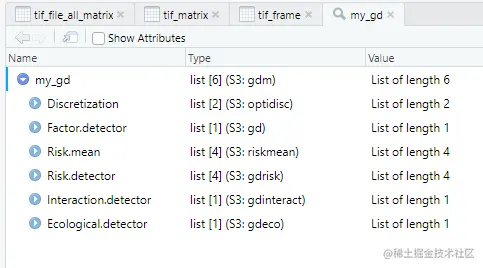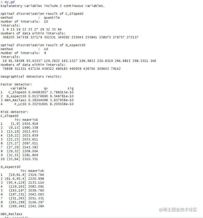 可以看到,my_gd变量包含了每一个连续变量在离散化后,对应的最优离散化方法与类别数量,以及地理探测器的各个分析结果。具体结果的含义与研读方法,大家参考# Geodetector地理探测器在Excel中的操作方法、# R语言geodetector包地理探测器分析的方法这两篇文章即可,这里就不再赘述。