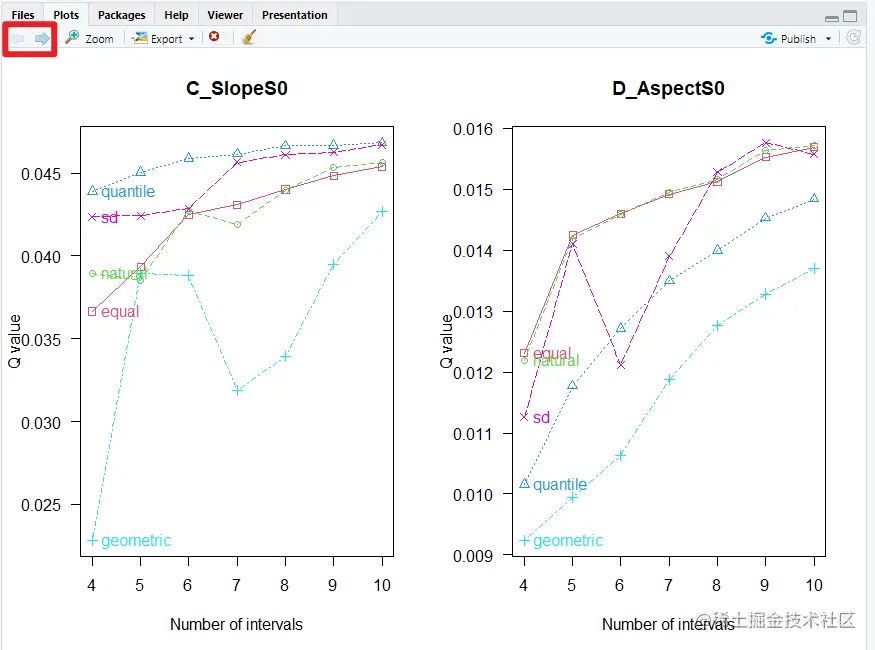 此时,在RStudio软件的右下方“Plots”中,即可看到可视化结果,如下图所示。其中,我们可以通过下图中红色方框内的箭头,实现不同图片的切换显示。