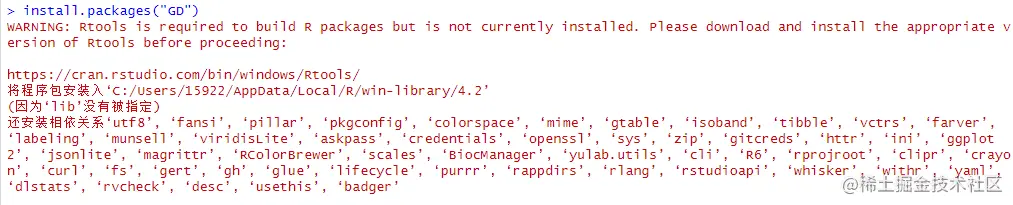 输入代码后,按下回车键,运行代码;如下图所示。在安装GD包时,会自动将其所需依赖的其他包(如果在此之前没有配置过)都一并配置好,非常方便。