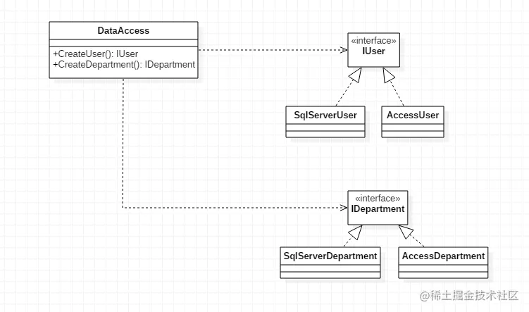 但此时还有一个问题就是,因为DataAccess中创建实例的过程使用的是switch语句,所以如果此时要增加一个数据库,比如Oracle数据库,就需要修改每个switch的case了,违背了开闭原则。对于这种情况,工厂方法模式里有提到过,就是使用反射机制,或者这里应该更确切的说是依赖注入(DI),spring的IoC中有遇到这个概念。