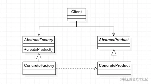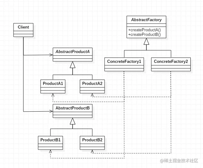 其中,AbstractFactory是抽象工厂接口,里面包含所有的产品创建的抽象方法;ConcreteFactory则是具体的工厂,创建具有特定实现的产品对象;AbstractProduct是抽象产品,有可能由两种不同的实现;ConcreteProduct则是对于抽象产品的具体分类的实现。