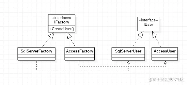 这就是工厂方法模式的实现,现在只需把new SqlserverFactory()改成下方注释那样的new AccessFactory()就可以实现更换数据库了,此时由于多态的关系,使得声明IUser接口的对象iUser事先根本不知道是在访问哪个数据库,却可以在运行时很好地完成工作,这就是所谓的业务逻辑与数据访问的解耦。