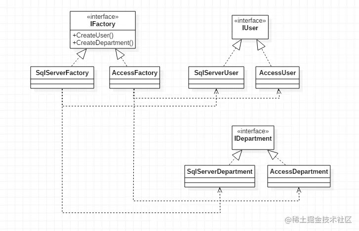 先更改一下IFactory接口,增加一个创建访问Department表对象的抽象的工厂接口。