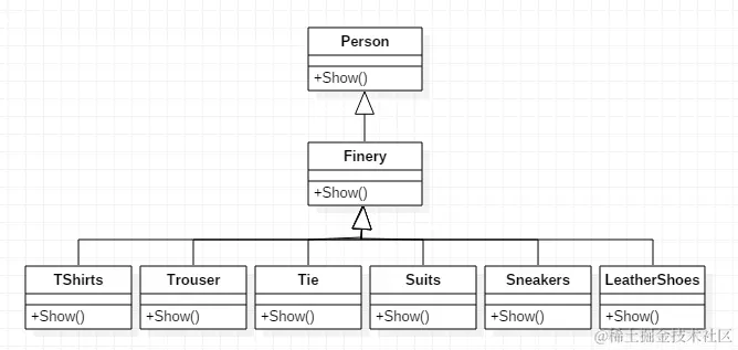 下面我们看一个例子,我们就以上面说的换装为例。我们先分析一下,换装需要有一个人类用于指定是谁换装、一个服装类为具体服装类的父类、以及服装类下的各种具体服装的类。UML图如下: