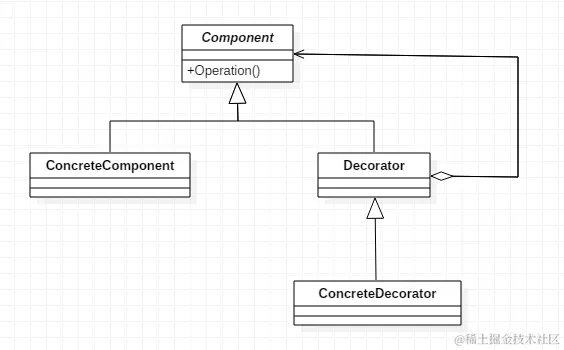 其中,Component是抽象构件,定义一个对象接口,可以给这些对象动态地添加职责;ConreteComponent定义一个具体对象,也可以给这个对象添加一些职责;Decorator是装饰抽象类,实现接口或抽象方法;ConreteDecorator是具体装饰对象,起到给Component添加职责的功能。。