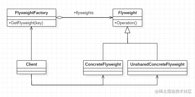 其中,Flyweight是抽象享元角色。它是产品的抽象类,同时定义出对象的外部状态和内部状态(外部状态及内部状态相关内容见后方)的接口或实现;ConcreteFlyweight是具体享元角色,是具体的产品类,实现抽象角色定义的业务;UnsharedConcreteFlyweight是不可共享的享元角色,一般不会出现在享元工厂中;FlyweightFactory是享元工厂,它用于构造一个池容器,同时提供从池中获得对象的方法。