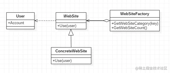 所以我们再加一个用户类,作为网站类的外部状态,并在use()方法中传递用户对象,UML如下: