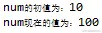 上方是一段测试代码,我们首先定义一个变量,起名为num,然后对它赋一个初值10,再对这个变量赋值为100,看两次值的变化,运行结果如下所示: