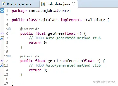 上面定义了一个接口,但要实现接口需要在类中用implements关键字,下面直接看例子,对应的接口是上例中的ICalculate。