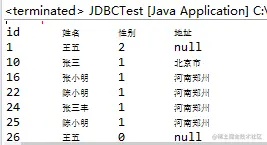 一般在数据库中我们将性别写为数字,然后用Java语言进行转换,比如上述运行结果,1代表男性、2代表女性、0代表未知,我们修改sex = rs.getInt("sex");这行代码如下: