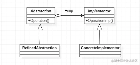 是不是感觉上面这段话很难懂,其实说简单点就是在Abstraction和Implementor之间架了一座桥(聚合线),这里体现了一个原则就是合成/聚合复用原则,具体看目录篇对基本原则的讲解及举例。下面放上模板代码。