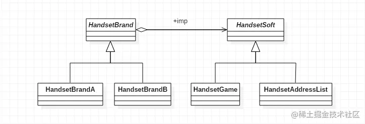 桥接模式,又叫桥梁模式,顾名思义,就是有座“桥”,那这座桥是什么呢?就是一条聚合线(下方UML图),比如我们下面会举的例子,手机有手机品牌和手机游戏等等,每个手机品牌都有多款游戏,那是不是二者之间就是聚合关系了,这是合成/聚合复用原则的体现,当我们发现类有多层继承时就可以考虑使用桥接模式,用聚合代替继承。