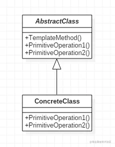其中,AbstractClass实现类一个模板方法,定义了算法的骨架,具体子类将重定义PrimitiveOperation以实现一个算法的步骤;而ConcreteClass实现了PrimitiveOperation以完成算法中与特定子类相关的步骤。