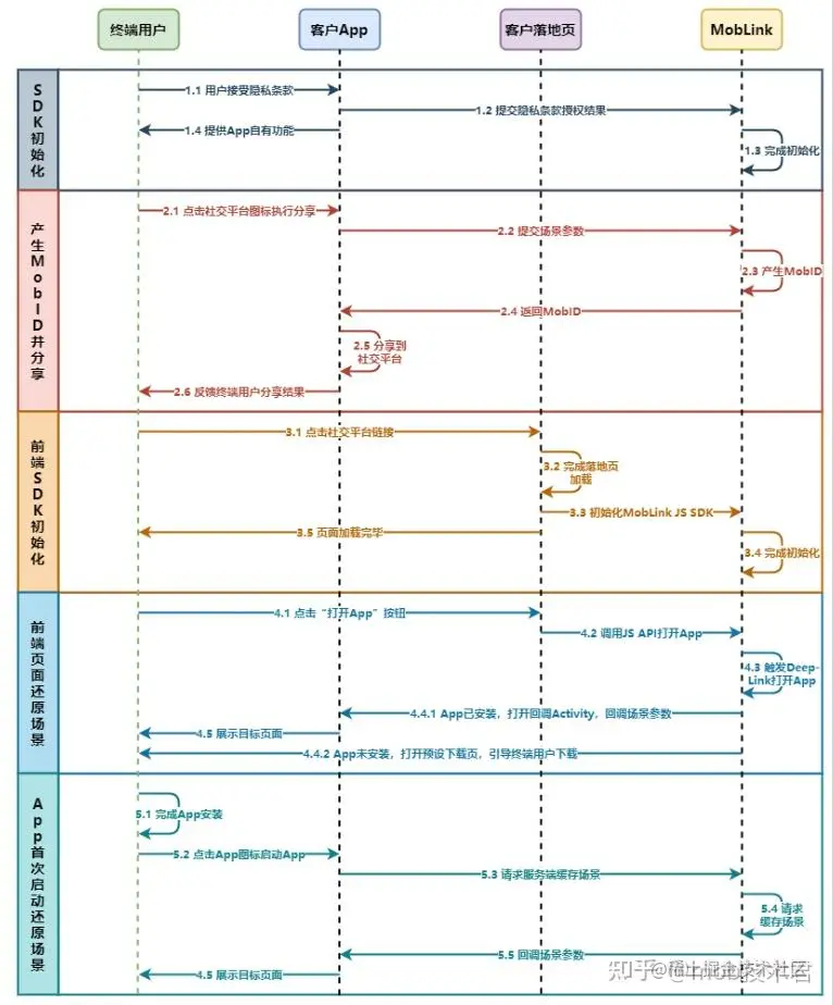 从图中可以看出,MobLink主要涉及三个部分:客户端、服务器和网页。客户端是指集成了MobLink SDK的App,服务器是指MobLink提供的云端服务,网页是指嵌入了MobLink JS的HTML页面。客户端、服务器和网页之间通过HTTP协议进行通信,传递场景参数和设备信息。
