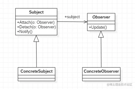 其中,Subject类是主题,它把所有对观察者对象的引用文件存在了一个聚集里,每个主题都可以有任何数量的观察者。抽象主题提供了一个接口,可以增加和删除观察者对象;Observer类是抽象观察者,为所有的具体观察者定义一个接口,在得到主题的通知时更新自己;ConcreteSubject类是具体主题,将有关状态存入具体观察者对象,在具体主题内部状态改变时,给所有登记过的观察者发出通知;ConcreteObserver是具体观察者,实现抽象观察者角色所要求的更新接口,以便使本身的状态与主题的状态相协同。