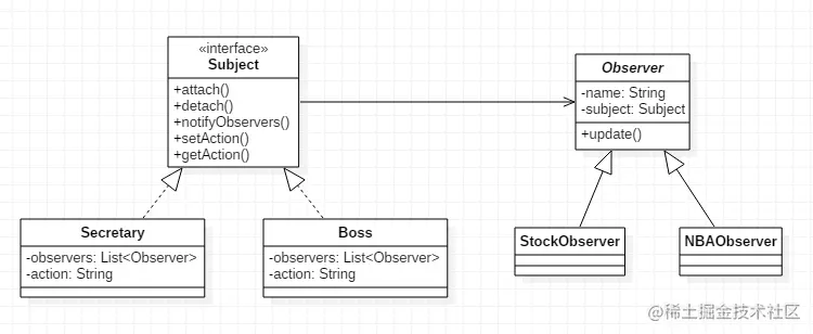 前台Secretary和老板Boss作为具体通知者,实现Subject接口。这里只给出Secretary类的代码,Boss类与之类似。