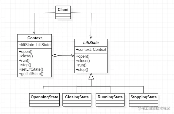 我们经常坐电梯都知道,电梯有多种状态,就按最简单的来说,包括运行状态、停止状态、开门状态、闭门状态。下面就以电梯运行为例,举一个具体的实例,UML图如下: