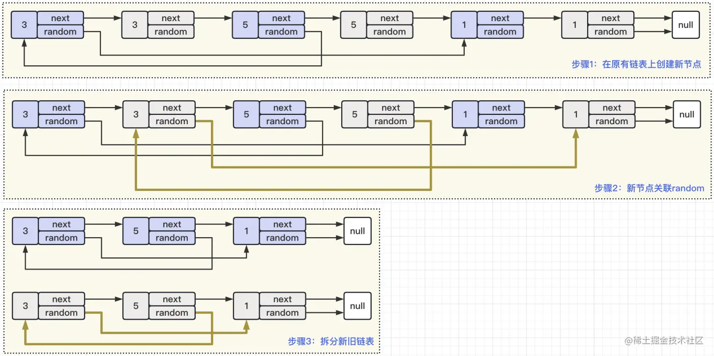 这样,我们就可以通过两次遍历旧的链表来解答这道题的,逻辑如下所示:
