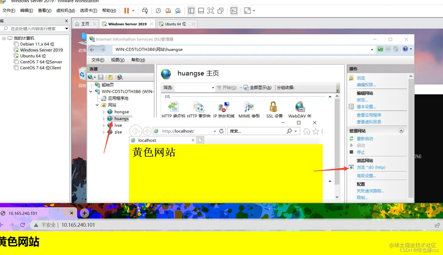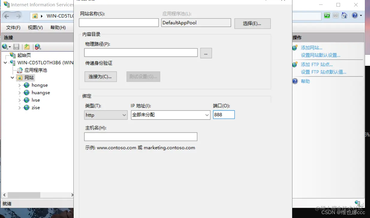 iis创建多个虚拟主机(根据端口) c900 2023-05-30 88 阅读1分钟 网络需要桥接 需要安装IIS 打开IIS 编辑 点击网站 编辑 右键新建网站 编辑 名称自定义 物理路径根据自己创建的来 端口huangse是80 编辑 然后创建绿色网站 编辑 名称和路径根据情况来 端口为88 编辑 然后是红色 端口888 编辑 编辑 然后是紫色 端口8888 编辑 编辑 物理路径 编辑 需要创建相对应的文件夹和文件 编辑 编辑