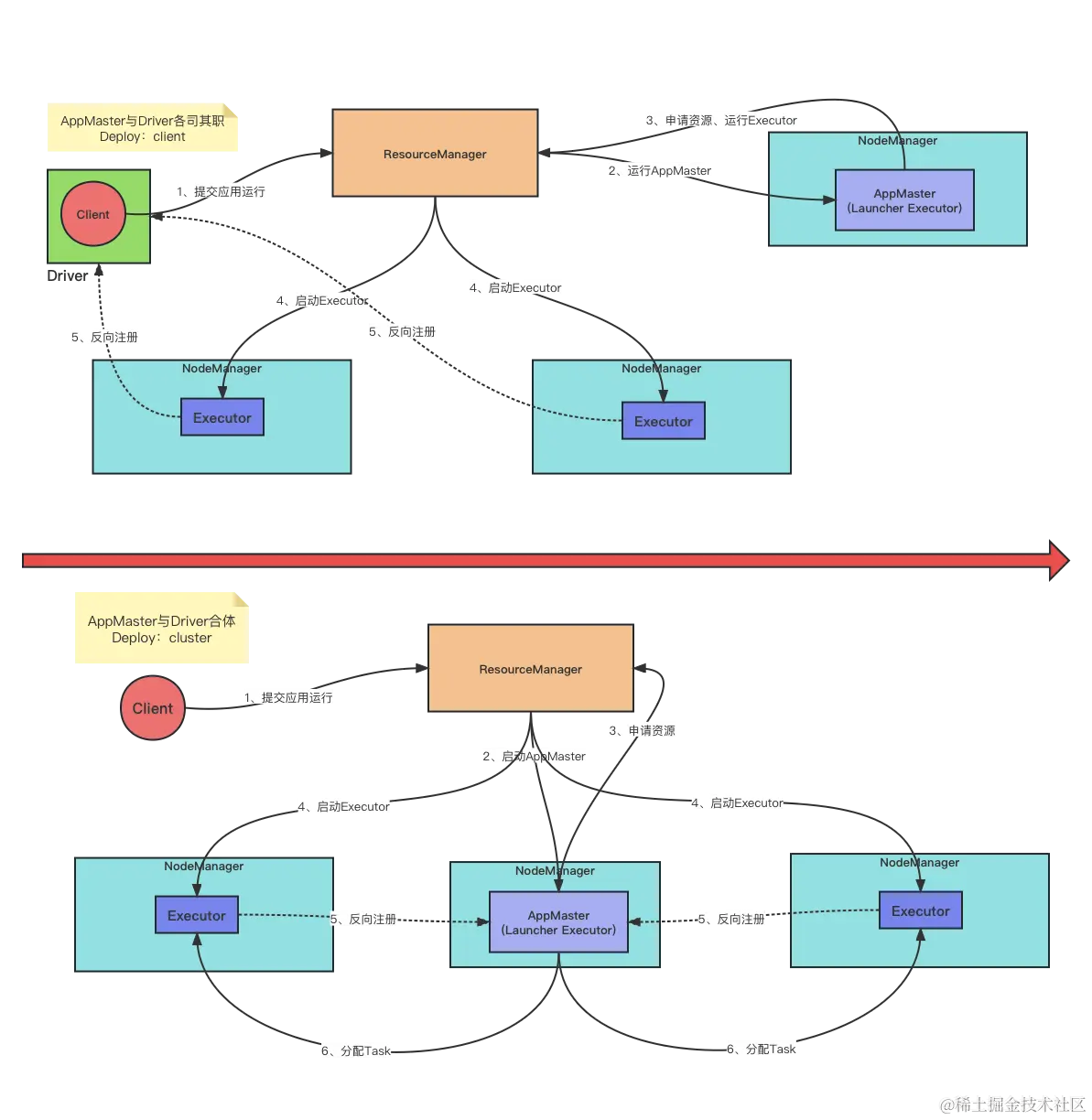 - ApplicationMaster 是 ResourceManager 根据用户提交了作业按照作业的上下文信息等分配出的一个 Container 资源,然后通知 Nodemanager 为用户作业创建出一个 ApplicationMaster。