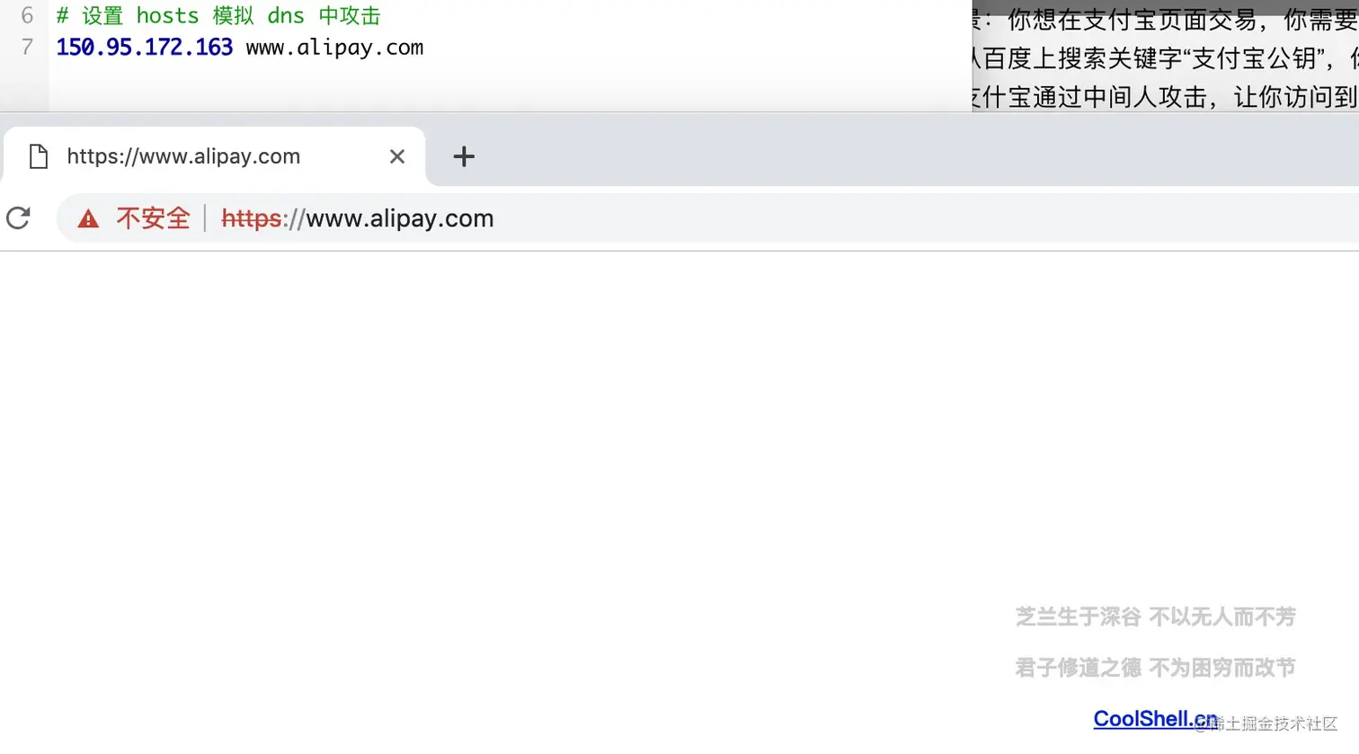 想象这个场景:你想在支付宝页面交易,你需要支付宝的公钥进行加密通信,于是你从百度上搜索关键字“支付宝公钥”,你获得了支什宝的公钥,这个时候,支什宝通过中间人攻击,让你访问到了他们支什宝的页面,最后你在这个支什宝页面完美的使用了支什宝的公钥完成了与支什宝的交易