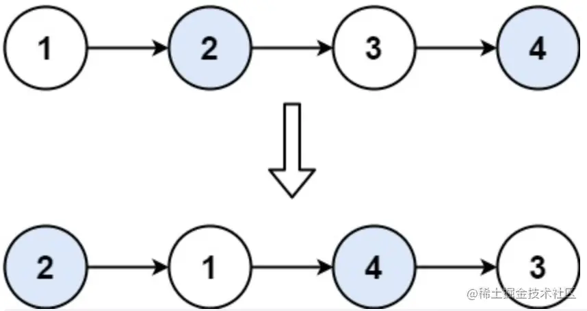 给你一个链表,两两交换其中相邻的节点,并返回交换后链表的头节点。你必须在不修改节点内部的值的情况下完成本题(即,只能进行节点交换)。