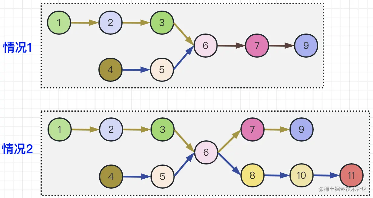 【情况2】我们可以看到两个链表在节点6的位置处相交了,但是又“分叉”出了两条链表,分别是:[7, 9]和[8, 10, 11],这种情况其实是不能发生的。因为我们节点的数据结构是一个单向链表,即:节点中只有一个next指针,所以无法在Node(6)的后置节点中即指向Node(7)又指向Node(8);