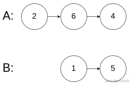 【解释】从各自的表头开始算起,链表 A 为 [2,6,4],链表 B 为 [1,5]。